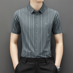 全新休闲男士商务短袖衬衫夏季薄款男式竖条纹衬衣通勤...