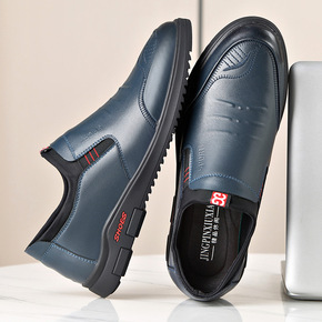 现货男办公室真皮蓝色纺织品类粘胶鞋纯色圆头低帮皮鞋...