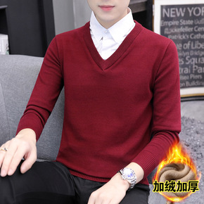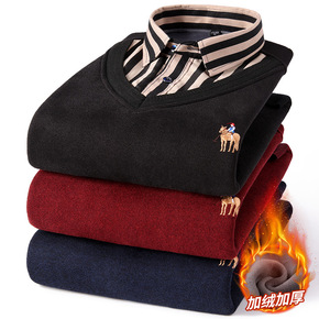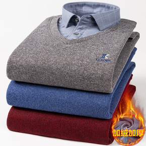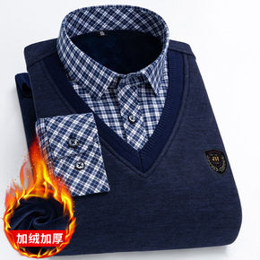 L-5XL中年冬季针织衫男士保暖加绒加厚假两件衬衫...
