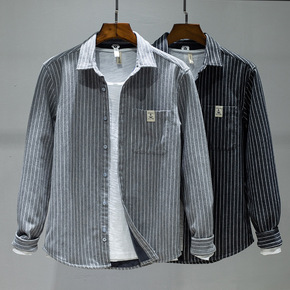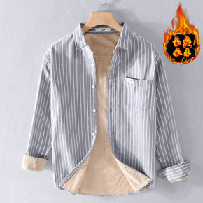 秋冬季男装条纹加绒保暖衬衫加厚休闲文艺潮男御寒衬衣...
