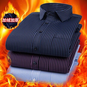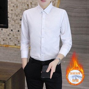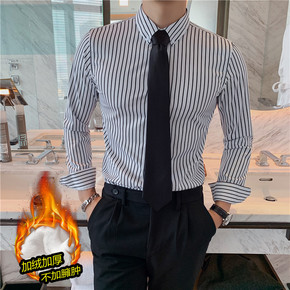 冬季加厚加绒条纹衬衫男长袖条子衬衫西装打底修身白色...