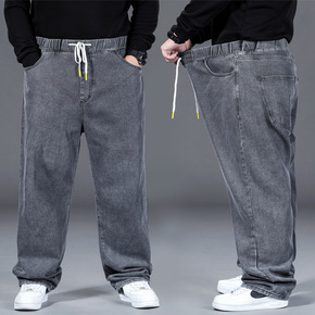 大码休闲牛仔裤男夏季加肥运动宽松直筒胖子肥佬松紧腰...