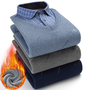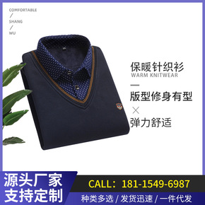 加绒加厚新款假两件毛衣男打底衫秋冬季中青年衬衫领针...