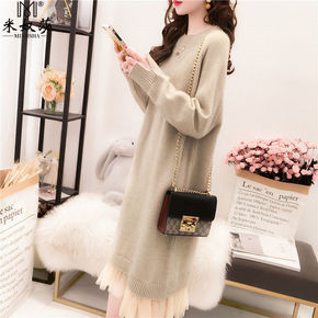 全身加绒/不加绒中长款毛衣女连衣裙宽松蕾丝针织打底...