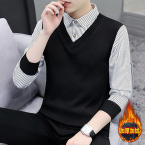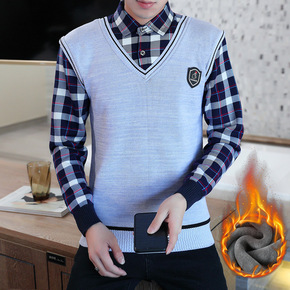 秋冬季假两件毛衣男韩版衬衫领加绒加厚针织衫男装有带...