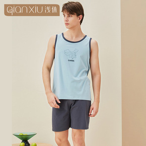 男士背心短裤家居服套装 浅休夏季新品 针织棉睡衣...