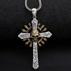 批发S925纯银泰国GU镶铜骷髅十字架吊坠毛衣链泰...