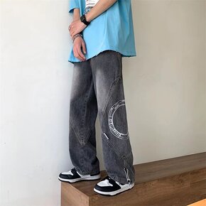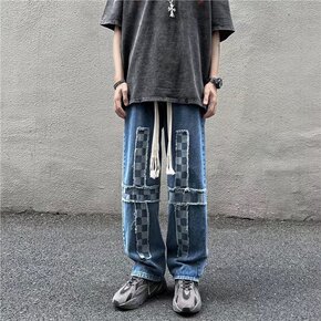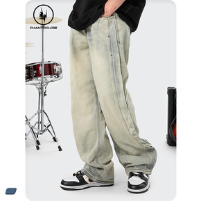 新款美式复古棕色牛仔裤男做旧水洗宽松显瘦拖地嘻哈渐...