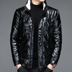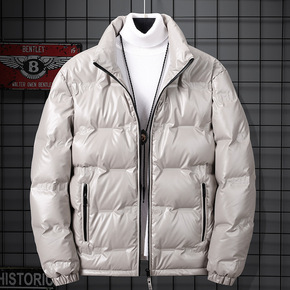 白鸭绒亮皮羽绒服男青年冬季轻薄毛绒立领短款男士亮面...
