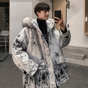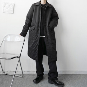 暗黑风大口袋装饰翻领长款棉衣男插肩袖宽松休闲棉服夹...