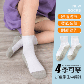 批发儿童运动袜白色学生袜男女童精梳棉中筒袜休闲中大...