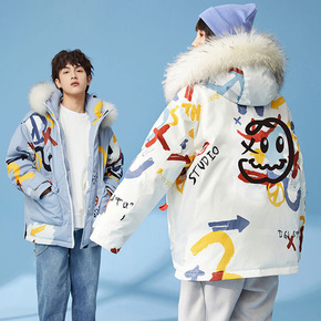 新款冬季羽绒服情侣加厚涂鸦男士外套潮牌青年韩版大毛...