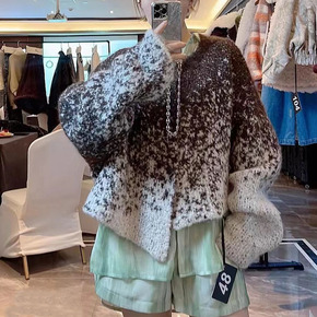 设计感不规则门襟圆领软糯毛衣外套慵懒风扎染雪花加厚...
