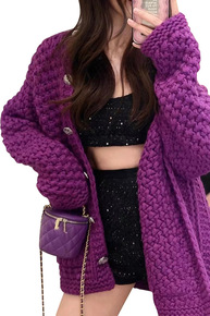 2022早秋新款紫色编织针织开衫外套粗棒针中长款时...