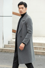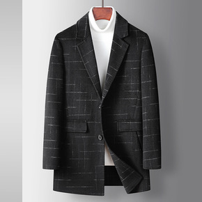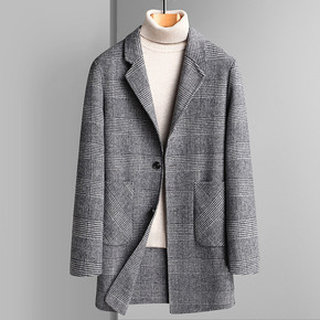 男式大衣2022秋冬中长手工双面呢大衣格纹商务休闲...