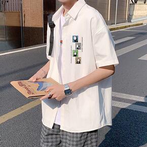 ins港风衬衫短袖夏天宽松潮流白衬衣男学生韩版休闲...
