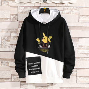带帽长袖T恤男学生秋季拼色皮卡丘卡通印花潮牌嘻哈春...
