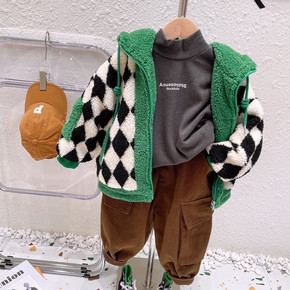 童装冬儿童毛毛衣加厚外套韩版格子拼色连帽上衣男童夹...