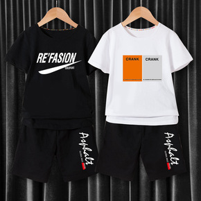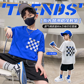 男童夏季潮棋盘格T恤套装2022中大童休闲运动短袖...