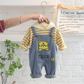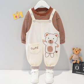 男童条纹长袖T恤卡通熊背带裤两件套春装新款儿童韩版...