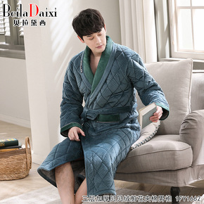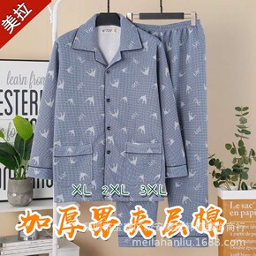 男秋冬男士睡衣三层薄夹棉中老年开衫加厚夹层棉宽松家...