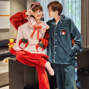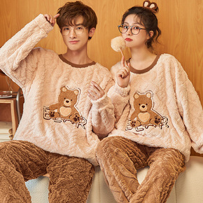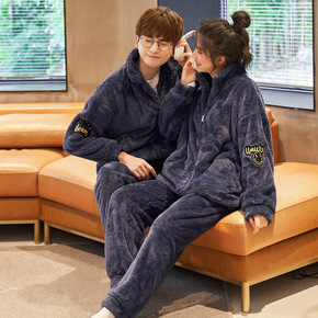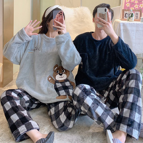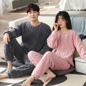 珊瑚绒睡衣情侣秋冬季款女套头加厚加绒法兰绒男可外穿...