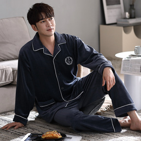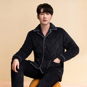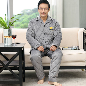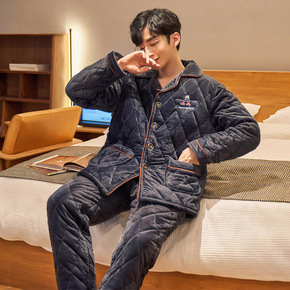 冬季睡衣男士加厚加绒三层夹棉两件装珊瑚绒保暖棉袄法...