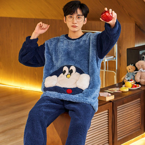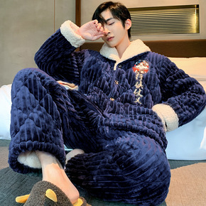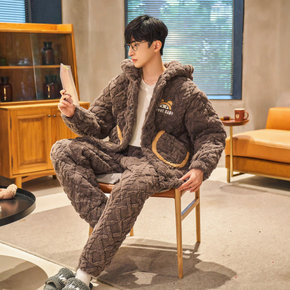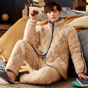 睡衣男士冬季加绒冬天保暖三层加厚夹棉袄珊瑚绒可外穿...