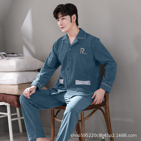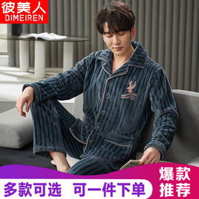 秋冬款睡衣男士德绒长袖保暖加绒中青年开衫翻领春秋季...