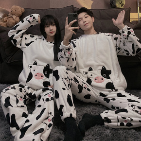 韩国情侣睡衣法兰绒冬季加厚圆领学院风卡通奶牛家居服...