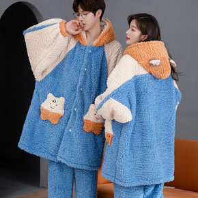 情侣睡衣2021新款长毛绒冬季加厚加大男码连帽卡通...