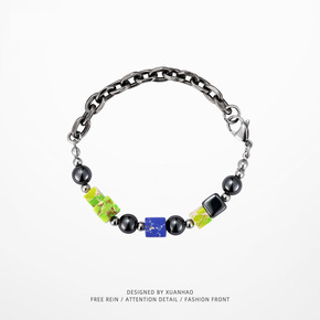 轩皓 新款国潮复古彩色石方块猫眼黑胆石手链 男潮...
