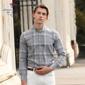 春秋季新款纯棉格子衬衫男士长袖牛津纺休闲格纹全棉衬...