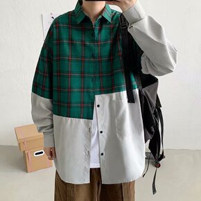 撞色格子衬衫男秋冬长袖宽松韩版潮流衬衣学院风百搭拼...