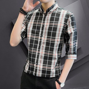 男式长袖衬衫春秋新款格子薄款修身衬衣休闲帅气开衫男...
