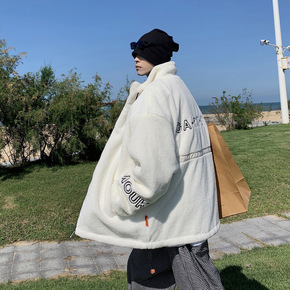 港风男装2021新款冬季羊羔毛加厚棉衣男宽松立领保...