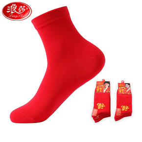 浪莎踩小人袜本命年红袜子棉质中筒男女结婚情侣袜秋冬...
