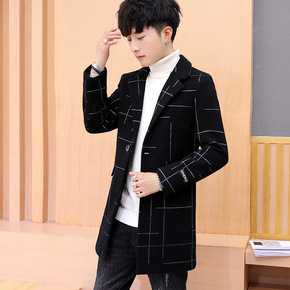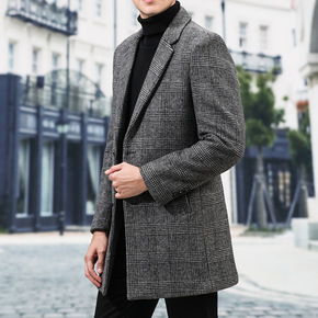 2019新款秋冬季格子羊毛呢大衣男青年中长款毛呢风...
