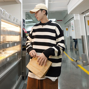 2021秋冬新款港风男士宽松条纹毛衣男青少年落肩袖...