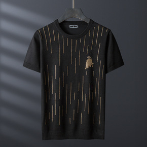 条纹短袖毛衣男秋季欧洲站小蜜蜂刺绣圆领休闲修身针织...