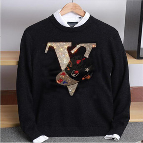 休闲烫钻字母男士毛衣修身型圆领现货时尚黑色毛线毛衣...