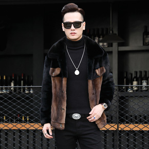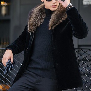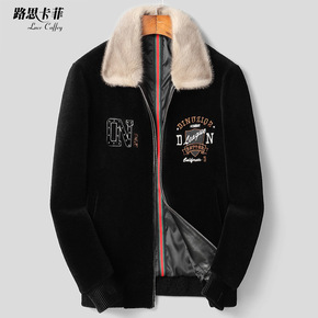 海宁羊剪绒男水貂毛领皮毛一体貂皮大衣羊羔毛外套刺绣...