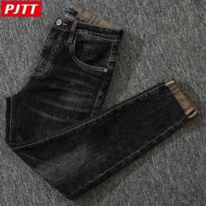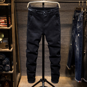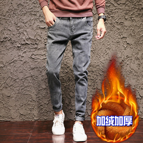冬装新款复古男式灰色牛仔裤 加绒保暖修身小脚裤潮男...