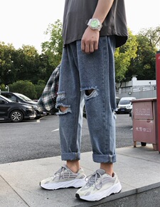 男生裤子ins原宿风潮流牛仔裤韩版宽松直筒乞丐裤夏...