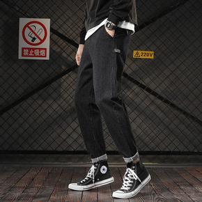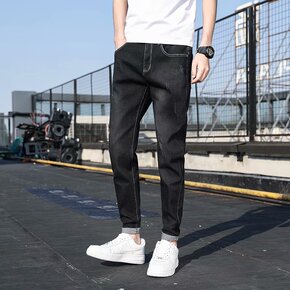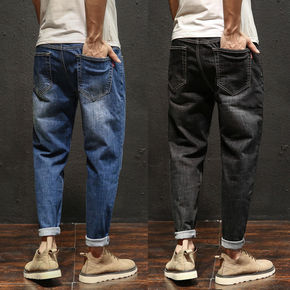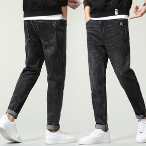 春季男士九分牛仔裤男宽松大码韩版潮流休闲黑色弹力哈...