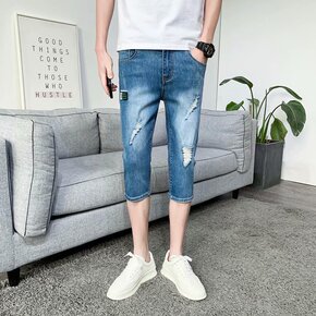 原宿bf风牛仔裤男潮牌毛边九分裤夏季韩版潮学生宽松...