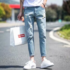 潮男破洞九分牛仔裤男士潮牌修身小脚休闲宽松裤子男浅...