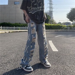 秋季新款高街嘻哈破洞水洗宽松牛仔裤男美式街头潮牌显...