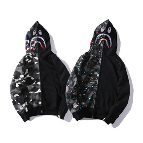 潮牌冬季男士休闲鲨鱼星空夜光拼色加绒卫衣...