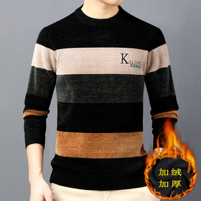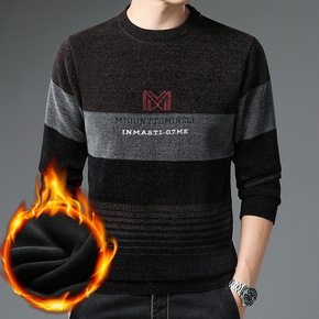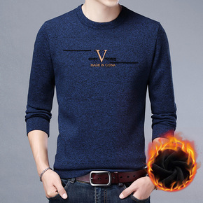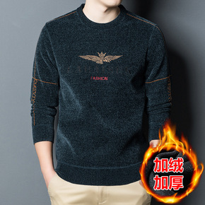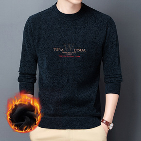 男士冬季毛衣加绒加厚印花雪尼尔中年圆领针织打底衫内...